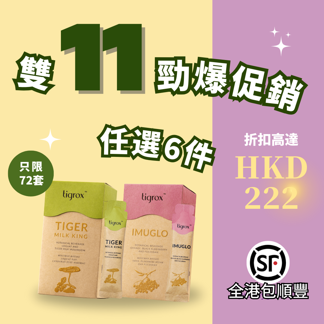 Tigrox 虎乳芝是最全面的虎乳芝配方,榮獲馬來西亞記錄大全銷量第一的虎乳芝飲料!同時搭配 Tigrox 系列的 IMUGLO 接骨木莓,有助於調節免疫力,雙重助力,加強功效!